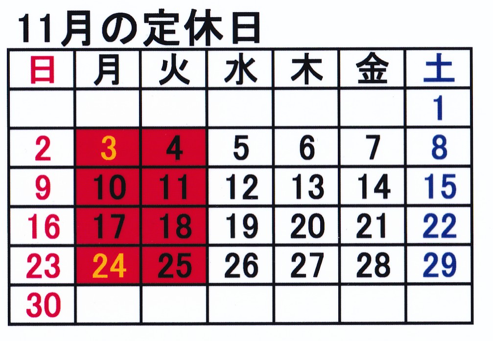※その日により、講習会、イベントなどの参加の為、早い時間に営業を終了する場合がございますので、お電話で確認をして頂ければ幸いです。赤の塗り潰しはお休みします。土曜日日曜日の予約が取りづらい状況が続いております。大変ありがたいことですが、半月前で午前中の枠が埋まってしまいます。ご予定が決まりましたらお早めにご連絡を頂ければ幸いです。